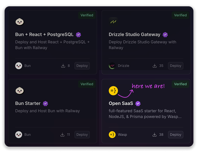 During LW #10 we announced a native integration with Railway in Wasp's CLI, allowing you to deploy your Wasp app with a single CLI command. Now, Railway has returned the favor - Open SaaS is one their verified template starters! You can take a look at it here.